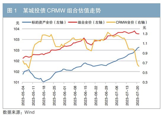 首先我们选取受到一定信用舆情冲击,但未实际爆发信用风险事件,总体处在正常状态的某城投债。该债券发行期限为3年期,票面利率4.98%,附带有某大行A创设的CRMW,一级组合收益为3.86%。2023年前三季度,由于该城投债所属地区舆情(区县非标违约等)和利好(政府积极救助)等因素多空交织,区域内城投券估值波动普遍较大,图1列出了该城投债在这一区间的估值走势。