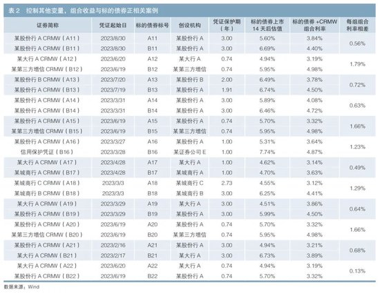 1.以下系列表格中,相邻两行同底色组合即可比组合;“上市14天后估值”是指标的债券的估值,标的债券估值一致,即意味着被保护债券信用风险一致;标的债券+CRMW组合利率是指发行时的组合利率。