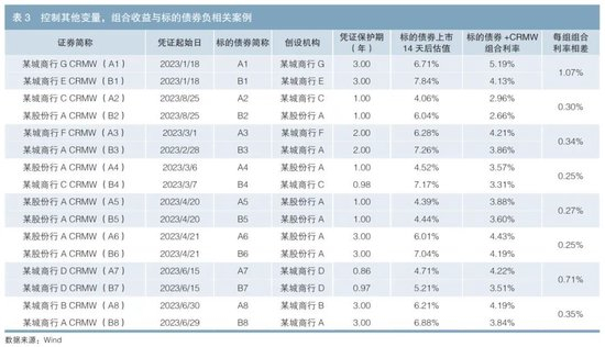 第一,同一发行日、相同发行人发行的同期限债券,创设机构信用品质非常接近时,存在标的债券信用风险完全一致,但每组标的债券+CRMW组合收益率相差0~26BP的情形。上述情形合计录得4组(见表1)。