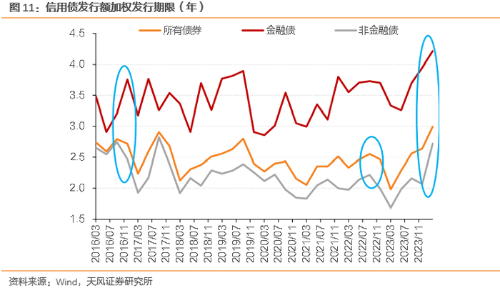 本轮“资产荒”,信用债发行期限明显拉长。信用债供给并不少,加权发行期限上各品种均明显拉长。所有债券的加权发行期限已经达到3.0年,为几轮“资产荒”中最长。
