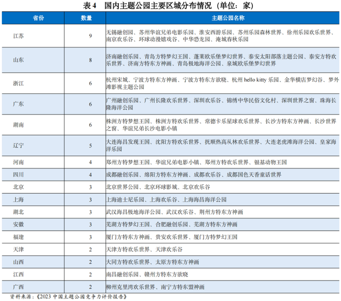 区域分布上,80家主题公园分布在20省、4直辖市和2自治区,总体呈现东多西少的特征。数量最多的前五个省分别是江苏(9家)、山东(8家)、浙江(6家)、广东(6家)和湖南(6家)。