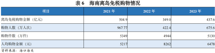 2023年4月1日,海南离岛免税“即购即提”“担保即提”提货方式落地实施:对单价不超过2万元(不含)且在政策清单内的离岛免税品,按照每人每类限购数量要求,可以选择“即购即提”方式提货;对单价超过5万元(含)的离岛免税品可选择“担保即提”方式提货。随着海南离岛免税政策的逐步放宽和优化,有效释放了消费者消费潜力。根据海关统计数据,2023年海口海关共监管海南离岛免税购物金额437.6亿元,同比增长25.4%;购物人数675.6万人次,同比增长59.9%;购物件数5130万件,同比增长3.8%;人均购物金额6478元,同比下降21.59%。