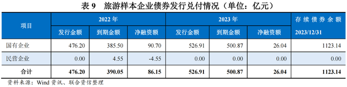 旅游发债企业以国有企业为主,整体融资规模在信用债市场占比较小,2023年旅游发债企业债券发行规模略高于兑付规模,债券融资呈净流入状态。
