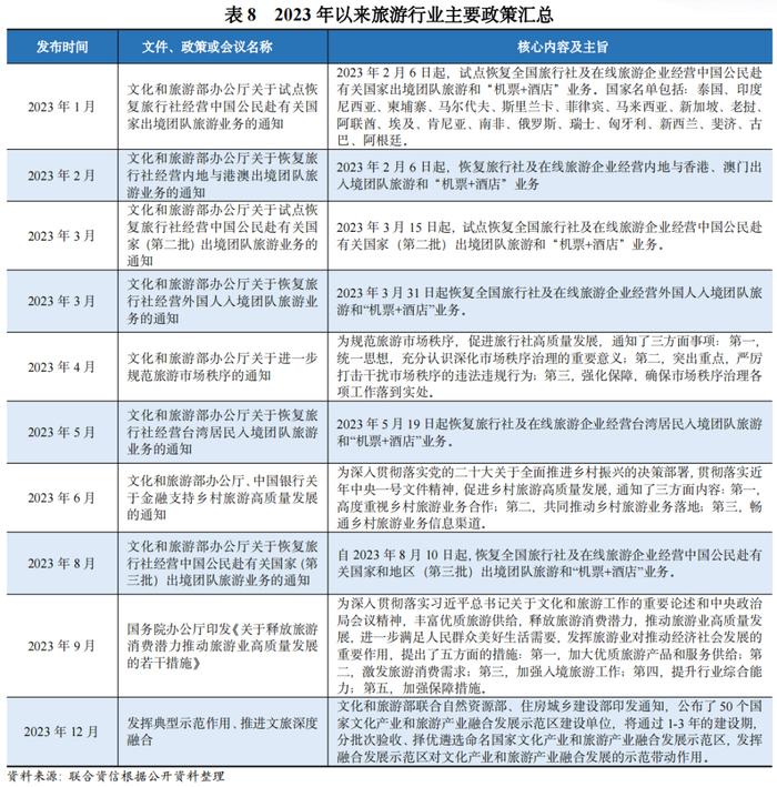 2023年以来,我国分批次逐步恢复出境旅游、入境旅游和港澳台旅游,国务院、文化和旅游部、中国银行等部门出台多项支持政策,从加大产品供给、优化旅游基础设施投入、改善旅游消费环境、完善旅游交通服务以及拓宽融资渠道等多方面给予指导及支持,积极推动旅游行业高质量发展。