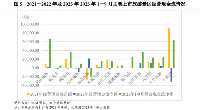 2023年,多数景区经营状况明显改善,客流量和盈利能力大幅提升,经营活动现金流整体表现为净流入,但盈利能力和现金流水平均未达到2019年同期。