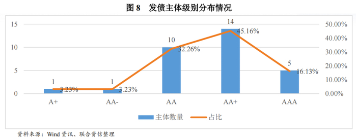 截至2023年底,联合资信选取了主体信用等级有效的旅游行业存续债发行人共31家,包含AAA级别发行人5家,AA+级别发行人14家,AA级别发行人10家,AA-级别发行人1家,A+级别发行人1家。下文分析均基于此样本。