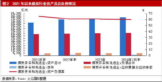 截至2024年2月末,煤炭开采和洗选业规模以上企业资产合计77,040.20亿元,同比增长1.80%;负债合计46,016.90亿元,同比增长1.60%,债务规模仍然较大;资产负债率59.73%,同比增长0.01个百分点,资产负债率仍保持较高水平,债务负担仍较重。截至2023年9月末,49家样本企业总负债规模合计为6.32万亿元,平均资产负债率为60.24%,同比略有下降。