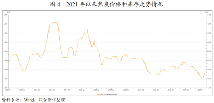 2021年以来,焦炭价格波动较大,但整体处于历史高位。其中,2021年1-10月,焦炭价格在供需紧张以及焦煤价格上涨的推动下大幅走高;进入11月,受需求端收缩、政策端对于煤炭保供限价以及进口煤放量等因素影响,焦煤供需紧张局面得到缓解,其价格快速下跌。2022年上半年,焦炭供应端偏紧,价格呈震荡上行态势;下半年在需求转弱的影响下,焦炭价格中枢明显回落,但全年均价仍同比增长0.88%至2841.58元/吨。2023年一季度焦炭价格相对稳定,二季度随着钢材价格走弱以及焦煤价格先行下移,焦炭价格持续走弱;下半年焦炭价格震荡上调,煤价上涨带动焦价上涨,但涨幅有限。2023年焦炭平均价格指数为2152.29元/吨,同比下降24.26%。2024年一季度,焦炭价格继续承压下行。