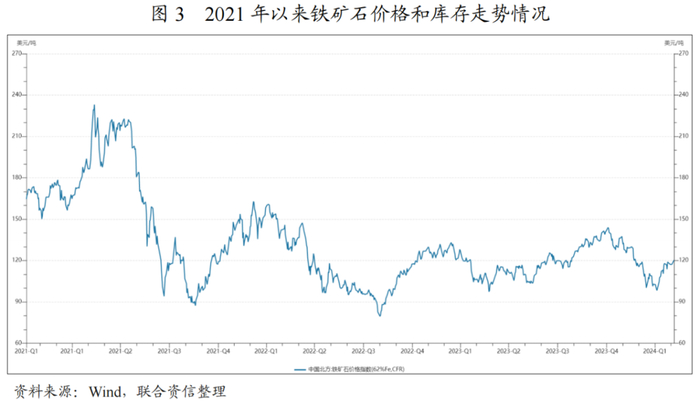 2021年以来,铁矿石价格冲高回落后整体呈高位震荡趋势。其中,2021年1-8月,受全球经济恢复以及主要经济体实行量化宽松货币政策影响,大宗商品价格大幅上涨,铁矿石价格指数月度均价攀升至183.97美元/吨;下半年随着中国粗钢产量下降,对铁矿石的需求减少,铁矿石价格快速回落。2021年全年铁矿石平均价格指数为159.49美元/吨。2022年上半年,受地缘政治冲突导致能源价格上涨、国际通胀等因素影响,铁矿石价格有所回升;随后由于需求疲软以及美联储持续加息影响,铁矿石价格震荡下行,但整体仍处于历史较高水平。2022年和2023年铁矿石平均价格指数分别为120.16美元/吨和119.75美元/吨。2024年一季度,全球铁矿石发运量持续增长,叠加国内粗钢产量小幅下降,铁矿石价格指数较2023年底有所回落。