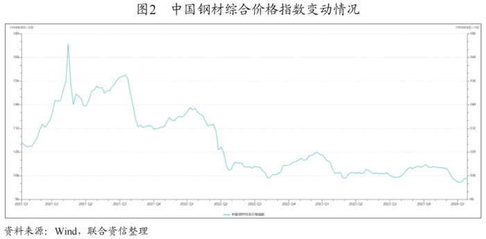 从钢材价格来看,2020年初受下游停工停产影响,钢材价格综合指数出现一定程度下跌。随后下游复产赶工需求强劲,推动钢材价格综合指数大幅走高。2022年一季度地缘政治冲突导致国际能源价格大幅增长,国外钢价大幅上涨拉动国内钢价增长;进入二季度以来受经济预期下降、钢材需求低迷影响,国内钢材价格在供大于求的背景下迅速回落。2022年全年平均钢材综合价格指数为123.36点,同比下降19.74点。2023年一季度,中国宏观经济预期回暖,钢材价格呈增长态势;二季度,钢材价格呈现“V”字走势,国内经济复苏情况不及预期叠加海外银行暴雷带来的流动性危机,导致钢材价格进入下行通道,6月下游需求阶段性释放,钢材价格修复性反弹;7-11月,房地产新开工面积下降,钢材供需处于弱平衡态势,整体价格窄幅波动;进入11月,随着房地产等利好政策发布,市场情绪得到提振,钢材价格小幅增长。2023年全年平均钢材综合价格指数为111.86点,同比下降11.50点。2024年一季度,市场需求不振,钢材价格持续下跌。