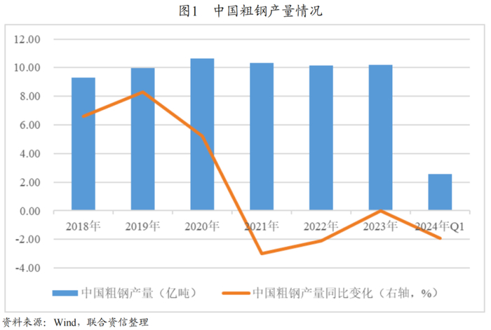 钢铁行业是重要的基础原材料工业,具有典型的强周期属性。钢铁行业的供给受下游需求和行业政策影响很大。2021-2023年,中国粗钢产量分别为10.33亿吨、10.13亿吨和10.19亿吨,呈波动下降趋势。2021年上半年,在内外需求增长拉动下,中国累计粗钢产量5.63亿吨,同比增长11.80%;下半年,随着“压减粗钢产量”等调控政策的落实,粗钢产量连续6个月同比下降,2021年全年中国粗钢产量同比减少约3200万吨。2022年,受下游需求偏弱以及行业盈利承压影响,中国粗钢产量同比继续下降。2023年,在国内钢材需求持续低迷、钢材出口量同比大幅增长的背景下,中国粗钢产量同比变化不大。2024年一季度,受下游有效需求不足及春节后需求启动延缓等因素影响,中国粗钢产量同比小幅下降1.9%。