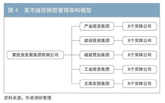 一是剥离政府融资职能,完善法人治理结构。做好重组顶层设计,将83家城投公司通过重组、撤并,按照“1+N+X”的模型,重新构建城投公司管理架构(见图4)。