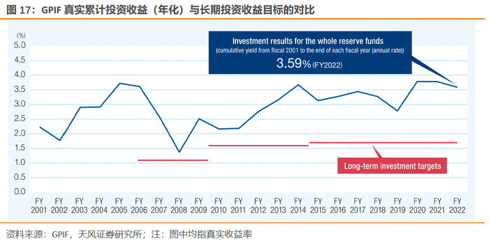 在国内利率一路走低的宏观背景下,GPIF通过资产配置行为调整,增厚收益。包括增配权益、走向海外、参与另类资产投资,这些调整手段均为其带来超出国内利率水平的回报。