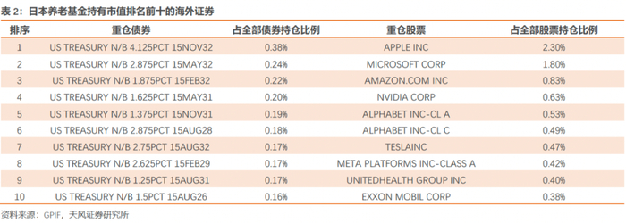 GPIF在海外配置上尤其青睐美国国债和美国科技股。其资产组合中,所持有的市值排名前十的海外债券均为美国国债;市值排名前十的海外股票则多为苹果、微软、亚马逊、英伟达、谷歌等美股科技巨头。