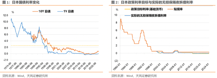 90年代后,日本央行政策利率逐步接近名义零利率。1991年开始,日本央行将贴现率(1995年之前的政策利率是贴现率,1996年后调整为无抵押隔夜拆借利率)从1991年最高6%下调至1995年9月的0.5%。伴随政策利率逐步接近名义零利率,10年国债收益率从1991年初的6.5%左右下行到1995年9月的3%,1年国债收益率从7%下行到0.5%。