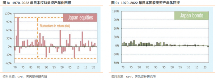 从数据上观察,2000年以前伴随日本10年国债收益率持续走低跌破2.5%,养老年金的收益也呈现下滑趋势;当2000年后日本十年国债在2%附近时,GPIF国内债券投资年度回报在2-3%左右;当2012年后日本债市利率进一步走低,GPIF的国内债券投资收益也明显受到影响,基本不超过1%、甚至大多数年份为负。
