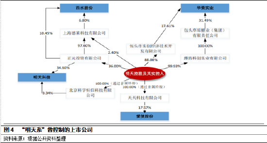 “明天系”是由明天控股有限公司(以下简称“明天控股”)及其旗下参控股子公司组成的族系集团。1993~1999年,实际控制人肖建华抓住“高科技”概念,以在中关村倒卖电脑迅速完成了原始积累,并于1999年9月成立了明天控股,作为“明天系”参与股权投资的主体。同时,肖建华利用人脉资源,借助老牌企业改制机会,将包头明天科技股份有限公司(以下简称“明天科技”)、包头华资实业股份有限公司(以下简称“华资实业”)推上市,并掌握其控制权,迅速增厚资本。