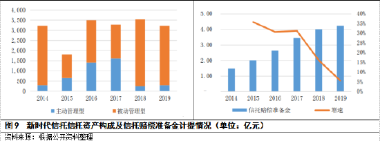 根据新时代信托2019年年报披露,新时代信托资产管理规模达到3,224.43亿元,其中主动管理型信托规模仅295.35亿元,通道业务规模高达近2,929.08亿元,而这些资金大部分通过新时代信托流向了“明天系”其他公司。举例来看,新时代旗下“蓝海”系列产品发行超过1,300期,几乎都是金融股权质押类的项目,质押最多的是包商银行股权,其它还有哈尔滨银行、新时代证券等金融机构。而另一方面,2014年以来,新时代信托提取的信托赔偿准备金逐年增加,且与信托资产增速背离,从侧面反映出其信托资产质量持续下滑。