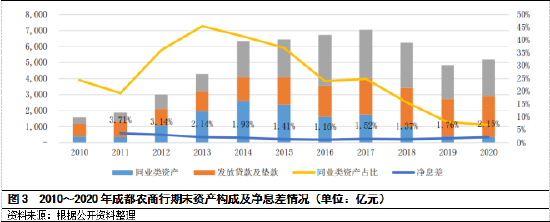 利益输送式关联交易中交易主体一方受益亦面临另一方的削弱。自2011年起安邦保险集团及其关联企业控股成都农商行,成都农商行通过同业业务等快速扩张资产,资产规模从1,876.98亿元于2017年末增至峰值7,055.62亿元,其中同业类资产占比最高达到45.50%,与银行回归本源的监管导向相悖,且与安邦保险集团及其关联企业通过非标投资形成利益输送,侵蚀资产质量,截至2020年6月末,90亿多层资管计划最终投入安邦保险集团实际控制人且已逾期。同时,安邦保险集团的高息资金协议存款影响成都农商行息差水平,截至2019年末安邦保险集团及其子公司存款743.88亿元,受2018年原保监会接管安邦保险集团后协议存款支取影响,成都农商行资产规模下滑,但由于高息成本降低,息差水平回升。