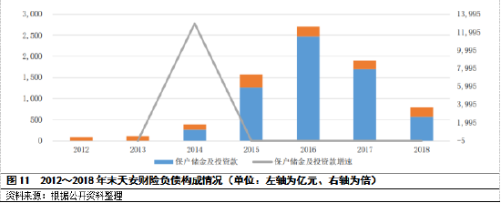 天安财险是新时代信托的大客户,其通过直接或间接购买信托计划的方式将保险资金转移至明天控股支配使用;截至2020年6月末,天安财险直接持有28只新时代信托产品,本息合计296.20亿元;同期末,因持有的信托产品等资产到期后发生实质性违约,天安财险对该类投资进行相应计提减值,涉及金额为577.45亿元。同时,“明天系”以实际控制的多家公司作为融资和担保主体,操控天安财险超出发售比例和销售规模销售投资型保险产品向社会公众非法吸收资金。2014年,天安财险发售投资性财产保险,带来保户储金及投资款的快速增长;2014~2018年,保户储金及投资款已成为天安财险负债最主要构成,占比最高时可达90%以上。