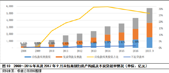 同时,2020年中国第二季度货币政策报告披露,包商银行为背后的“明天系”连续十余年提供关联贷款1,500亿元,大部分形成坏账,每年关联贷款造成的利息费用缺口高达百亿元。包商银行通过向“明天系”的关联企业授信及提供非标融资,提供了将银行资金流向“明天系”的渠道,且在部分企业为失信被执行人的情况下,包商银行仍向其授信,说明大股东操纵着包商银行的经营活动。从包商银行主要财务数据及指标表现上可见端倪,2008年以来,包商银行资产快速扩张,从619.36亿元增至2017年9月末的5,762.38亿元,增长达到9倍多,其中由信托计划、资产管理产品等非标投资构成的应收款项类投资占比大幅增长,与一般银行资产构成趋势不符,同时不良贷款率整体上升,截至2017年3月末,逾期90天以上贷款与不良贷款的比率为192.21%,不良贷款偏离度较高,资产质量承压。