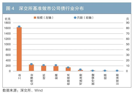 根据万得(Wind)行业分类,当前交易所基准做市公司债覆盖行业相对集中(见图3、图4)。上交所覆盖工业、能源、公用事业、材料、信息技术、日常消费、可选消费7个行业;深交所覆盖工业、公用事业、材料、金融、信息技术、可选消费、医疗保健、能源、日常消费9个行业。不管从只数还是规模看,基准做市公司债都集中在工业行业,占存量半数以上。这或与交易所信用债基准做市品种入池标准有关。随着基准池规则的不断优化和市场的整体发展,更多元化的发行人主体有望被引入,基准池行业结构将不断优化。