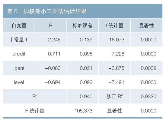 残差异方差性存在可能会造成回归模型的参数估计不是最佳无偏估计,显著性检验失效;自相关性可能会使得最小二乘估计量严重歪曲真实情况。为了改善上述情况,本文运用加权最小二乘法对逐步回归模型参数进行估计来消除影响。加权最小二乘法进行修正后得到的回归结果如表6所示,可见采用加权最小二乘法的回归模型拟合优度较好,各解释变量均显著,修正可决系数达到0.932。随后,本文再次对模型进行怀特检验和LM检验,检验结果见表7、表8,结果显示异方差性和自相关性已消除。