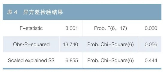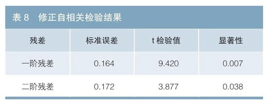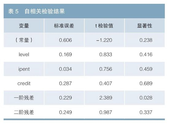 二是自相关性。逐步回归结果显示,DW检验值为0.955,介于下临界值0.507和上临界值2.097之间,故凭借DW检验值不能判断是否存在自相关。因而对残差进行LM检验,得到的结果如表5所示,说明随机干扰项存在一阶自相关。