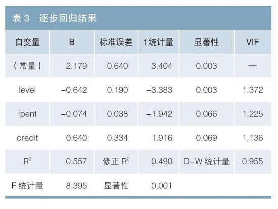 造成上述结果的原因可能是不同的解释变量之间存在多重共线性,为了消除这种影响,本文采用逐步回归重构解释变量组合,得到的结果如表3所示。