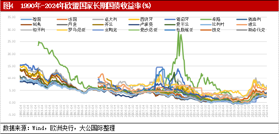 受近几年全球地缘政治变局和意识形态冲击影响,欧盟内部的政治局势出现动荡,对欧盟债券市场一体化进程形成一定掣肘。第一,部分欧洲民众拒绝进一步一体化,包括“英国脱欧”、德国“牙买加联盟”谈判、西班牙加泰罗尼亚独立运动及意大利五星运动等事件。其中,“英国脱欧”对欧盟债券市场一体化影响最大,降低了市场层面的信息流动和金融资源配置效率。第二,欧洲内部因俄乌冲突产生矛盾及分化。各国之间在战略防卫措施、移民政策等方面形成巨大分歧,并导致右翼势力扩大。2024年6月以来,欧盟议会选举中出现欧洲政治光谱向右转,部分国家如法国受政治局势动荡影响,与德国10年期国债收益率利差扩大,其国债收益率受到一定冲击。第三,市场信心受到冲击。受前述两项因素影响,欧元汇率稳定性承压,欧元债券资产竞争力减弱,导致全球投资人对欧盟债券市场的信心下降。