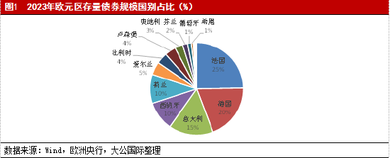 从存量规模来看,截至2023年12月,欧元区存量债券规模为20.98万亿欧元,占全球债券市场存量债券规模的比重超过16%,仅次于美国。按发行人结构来看,截至2023年12月,欧元区债券余额中政府部门、货币金融机构(MFIs)、除MFIs外的其他金融企业、非金融部门的占比分别为51.3%、24.2%、16.9%和7.6%。分币种来看,欧元区债券以欧元计价为主,非欧元债券规模较小,截至2023年12月,欧元计价债券占比88.9%,非欧元计价债券占比11.1%,虽然非欧元计价的债券体量仍较小,但近些年占比延续回升。分期限来看,长期债券余额占比92.8%,短期债券余额占比7.2%。分国别来看,各国债务规模与其经济体量总体呈现一定的正相关,经济体量相对靠前的欧元区国家,其债券市场存量规模也相对越高。截至2023年末,债券存量规模靠前的国家包括法国、德国、意大利、荷兰和西班牙,其债券存量规模合计占比高达79.9%。从券种结构来看,目前欧元区债券市场中主要交易品种包括国债、市政债、公司债、可赎回债、货币市场工具和回购协议等。其中,政府债券(国债为主)市场是欧洲最大的债券市场。截至2023年末,法国、意大利、德国和西班牙的政府债券规模分别为2.57万亿欧元、2.37万亿欧元、2.19万亿欧元和1.38万亿欧元,合计约占欧元区整体政府债券规模比例达79.12%。