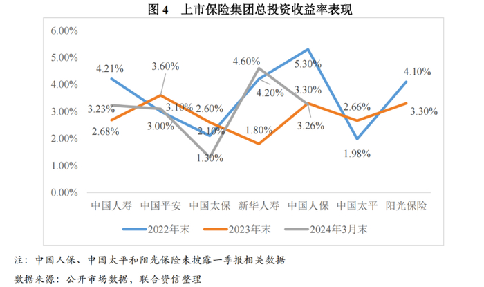 2023年以来,主要上市保险集团投资资产规模保持增长,投资资产配置仍以固定收益类资产为主;资本市场波动或对主要上市保险集团投资收益增长带来一定负面影响,各公司投资策略及投资管理能力的差异使得投资收益率表现存在分化情况。2023年以来,宏观经济复苏不达预期且国内有效需求不足,加之资本市场低位震荡以及国债利率持续下行,这对于各公司投资管理提出了更高要求,在此背景下,各公司积极提升资本配置能力,加强资本市场研判,投资业务风险偏好有所收紧,随着可运用资金规模的增长,投资资产配置力度均有所提升。投资收益方面,2023年,受到权益市场波动加剧及利率中枢下移影响,中国人寿、新华人寿、中国人保、阳光保险投资收益率较2022年有所下滑;2024年一季度,各保险公司投资资产配置管理逐步加强,得益于趋于稳健的投资策略及对于资本市场周期性更好把控,中国人寿及新华人寿投资收益率均有一定程度上升;由于资本市场波动性仍存,中国平安中国太保和中国人保投资收益率存在一定下行。投资结构方面,上市保险集团的投资资产结构变化不大,长久期的固定收益类资产为主要配置,同时将低估值、高股息、长期盈利的股票作为权益投资资产主要配置策略。