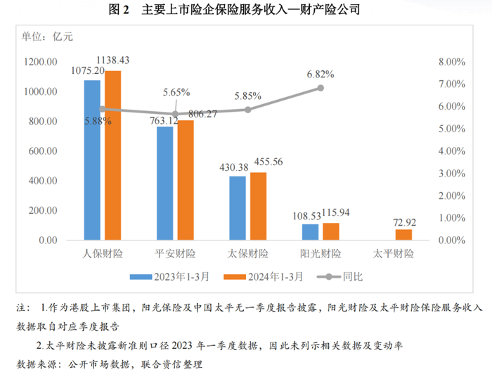 2023年,随着全国乘用车销量增长推动车险业务需求增长,加之非车险险种业务较好开展,使得各财产险公司保险服务收入均有不同程度增长。2024年一季度,各主要上市保险集团车险业务收入增速均同比下降,保险服务收入增速趋同。