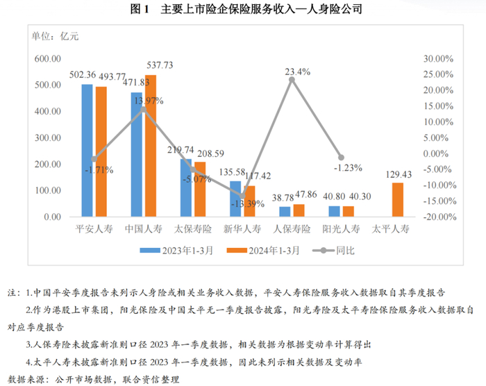 受前述因素持续影响,2024年一季度人身险公司保费收入持续提升;2024年1—3月,人身险公司实现原保险保费收入16639亿元,按可比口径同比增长5.1%;其中寿险业务原保险保费收入13970亿元,同比增长13.83%;健康险原保险保费收入2547亿元,同比增长6.79%;意外险原保险保费收入122亿元,同比下降7.58%,寿险业务仍为人身险公司保费收入增长驱动力。此外,2024年2月末,经代渠道正式执行“报行合一”,后续对相关渠道产品结构及业务收入影响仍需保持关注。市场集中度方面,2024年一季度,人身险行业市场份额排名前三的险企业绩表现及市场份额较为稳定;但新华人寿保险业务收入同比均下降约10%,导致其排名下降至第七;另一方面,泰康人寿和中邮人寿保险业务收入均同比上涨约20%,使得中邮寿险排名首次提升至第五位,2024年一季度,保险业务收入排名前五的人身险公司市场份额合计超过50%,市场集中度仍处于较高水平。