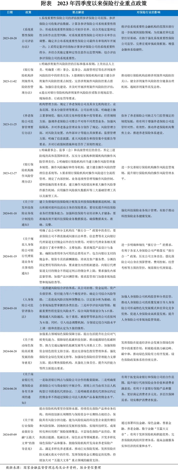 2023年四季度以来,国家金融监督管理总局先后发布了《系统重要性保险公司评估办法》《养老保险公司监督管理暂行办法》《银行保险机构操作风险管理办法》《人身保险公司监管评级办法》《关于商业银行代理保险业务有关事项的通知》等内容(详见附表),评估系统重要性金融机构的范围拓展到保险领域、增强养老保险公司监督管理、细化保险公司操作风险管理要求、加强人身保险公司机构监管和分类监管、深化银保合作渠道等方式,加强保险业风险管控手段,推动保险行业监管制度体系不断完善,有利于保险业可持续健康发展。