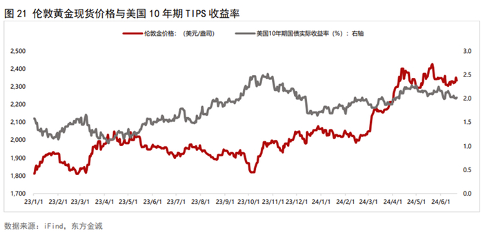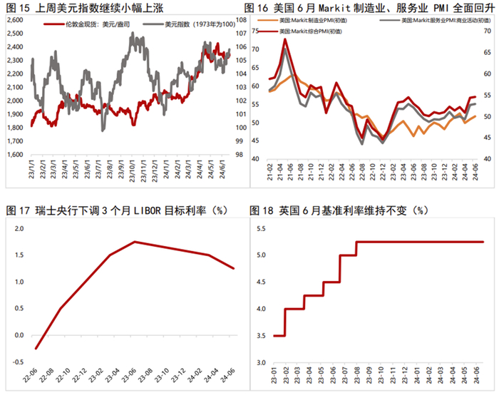 上周黄金价格冲高回落,整体小幅下行。上周五(6月21日),沪金主力期货价格较前一周五(6月14日)上涨2.05%至559.74元/克,COMEX黄金主力期货价格较前一周五下跌0.58%至2334.70美元/盎司;黄金T+D现货价格回升1.88%至556.33元/克,伦敦金现货价格下跌0.47%至2321.45美元/盎司。具体来看,上半周公布的美国零售销售环比增速以及多项地产相关数据均不及预期,经济数据走弱强化了市场降息预期,提振金价上涨。但下半周受英国、瑞士等欧洲经济体央行货币政策偏鸽影响,美元指数上行,加之周五公布的美国6月Markit制造业和服务业PMI数据全线超预期,令金价承压回落。整体上看,上周国际金价先扬后抑,整体波动下行。