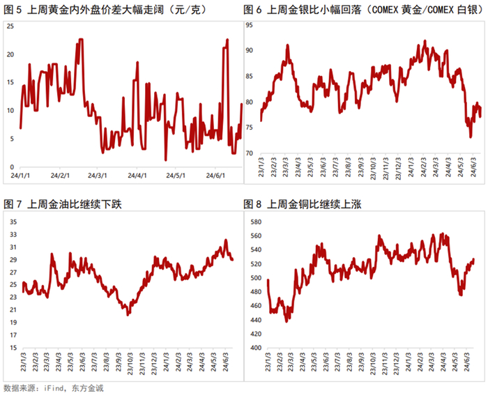 上周五黄金内外盘价差为11.20元/克,较前一周五的2.43元/克大幅上涨,主要有两个原因:一是美国6月MarkitPMI数据大幅好于预期,令国际金价承压回落,二是陆家嘴金融论坛上金融监管总局李云泽局长发言称“积极探索保险资金试点投资上海黄金交易所黄金合约及相关产品”,投资者多头情绪上涨,带动国内金价上涨。上周金油比继续小幅下跌,主因原油价格涨幅更大。同时,上周金银比小幅回落,而金铜比继续上涨,前者源于白银表现强于黄金,后者主因铜供给预期改善,叠加美元走强,带动铜价继续下跌,且铜价跌幅超过黄金。
