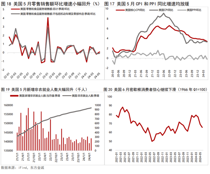 美国5月零售销售环比增速不及预期,前值进一步下修。6月18日,美国商务部公布的数据显示,美国5月份零售销售额环比增长0.1%,低于市场预期的0.3%,前值则由0%下修至-0.2%。零售销售几乎全面不及预期,具体来看,除汽车外零售销售环比-0.1%,预期0.2%,前值0.2%;核心零售销售(剔除汽车、汽油、建筑材料和食品服务)环比增长0.4%,预期0.3%,前值-0.5%。在美国商务部跟踪的13个类别中,有五个类别出现下降,其中,汽油和食品服务支出是最大的下行驱动因素。