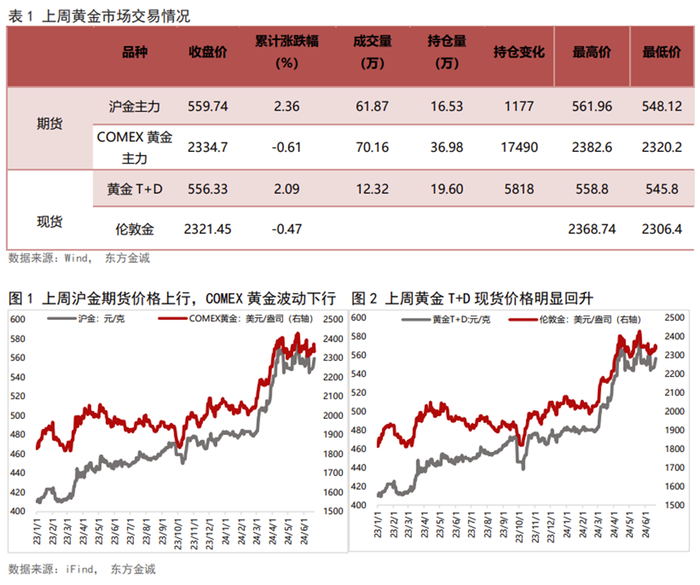 上周五(6月21日),沪金主力期货价格收于559.74元/克,较前周五(6月14日)上涨11.26元/克;COMEX黄金主力期货价格收于2334.70美元/盎司,较前周五回落13.70美元/盎司。现货方面,上周五黄金T+D现货价格收于556.33元/克,较前周五上涨10.29元/克;伦敦金现货价格收于2321.45美元/盎司,较前周五下跌10.85美元/盎司。