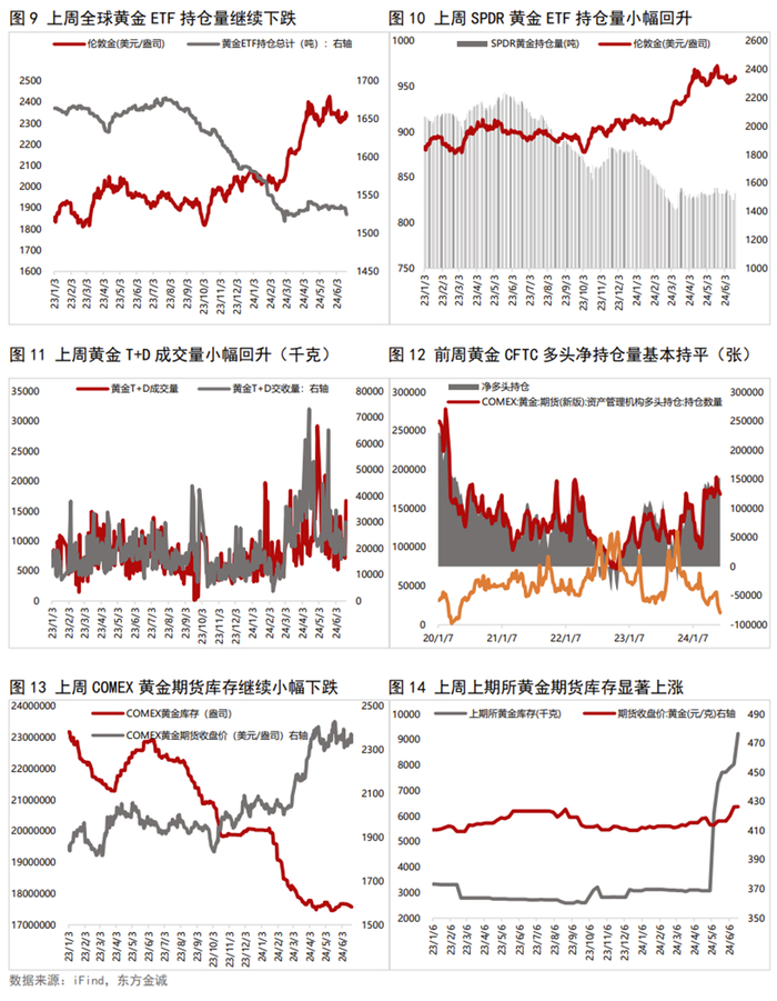 期货持仓方面,截至6月11日(目前最新数据),黄金CFTC资管机构多头净持仓量与上一周基本持平,主因多头和空头持仓量降幅基本一致。库存方面,COMEX黄金期货库存继续小幅下跌,而上周五上期所黄金仓单为9243千克,较前一周五增加1200千克。