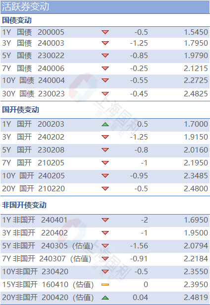 74D贴现国债249935成交在1.46;1年国债200005成交在1.545-1.55;3年国债240003成交在1.795-1.808;5年国债230022成交在1.9775-1.99;7年国债240006成交在2.121-2.1275;10年国债240004成交在2.272-2.28;30年国债230023成交在2.4825-2.49。