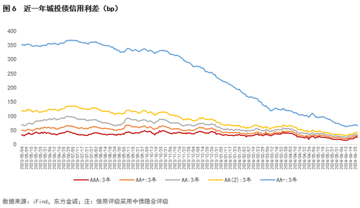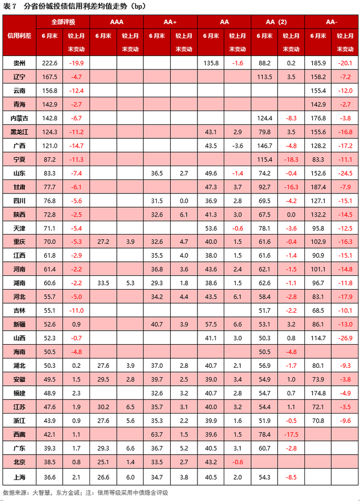 6月,主要评级、期限城投债收益率下行幅度多数不及同期限国开债,信用利差小幅走阔。