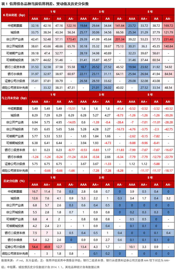 6月,信用债供求矛盾延续,各品种信用债信用利差波动为主,短端多数上行,其中中长端多数下行;多数品种等级利差及期限利差继续收窄,目前均处于历史低位。