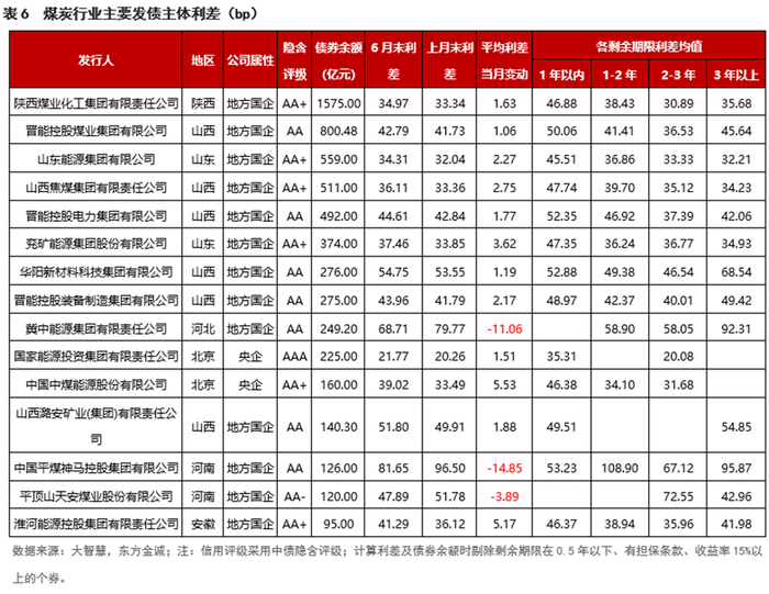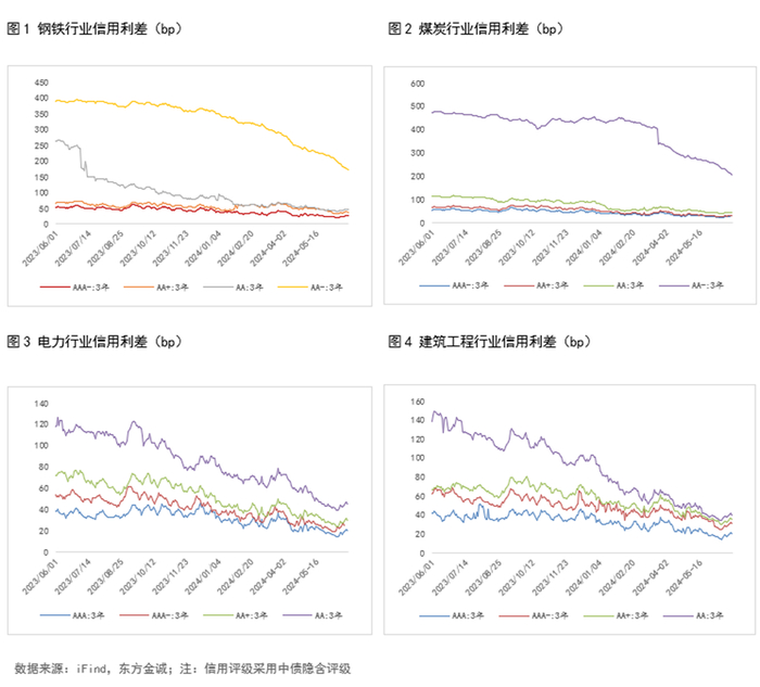 6月钢铁、煤炭行业各评级债券信用利差走势分化,高等级利差多数小幅走阔,AA-级利差收窄幅度较大,显示投资者下沉资质;当月主要钢铁、煤炭发债主体利差多数走阔。6月电力、建筑工程行业各评级债券利差先下后上,6月18日起利差小幅回调,整体利差水平仍在近一年低位。