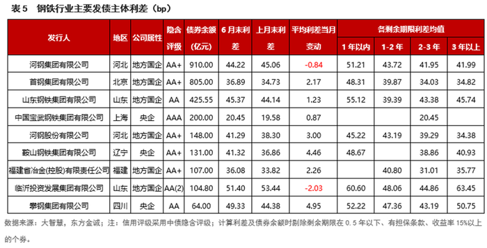 产业债:6月AAA级产业债信用利差涨跌互现,公募债利差多数小幅走阔,私募债利差多数收窄。公募债中,非银金融、房地产、社会服务等行业利差收窄,其余行业利差走阔;私募债中,煤炭、钢铁、基础化工、建筑材料等行业利差上行,其他行业利差均收窄。重点行业中,钢铁、煤炭行业主要评级利差走势分化,低等级信用利差多数收窄;电力、建筑工程行业主要评级利差低位震荡;房地产行业利差先收窄后走阔,债券存续规模较大的房企利差多数收窄。