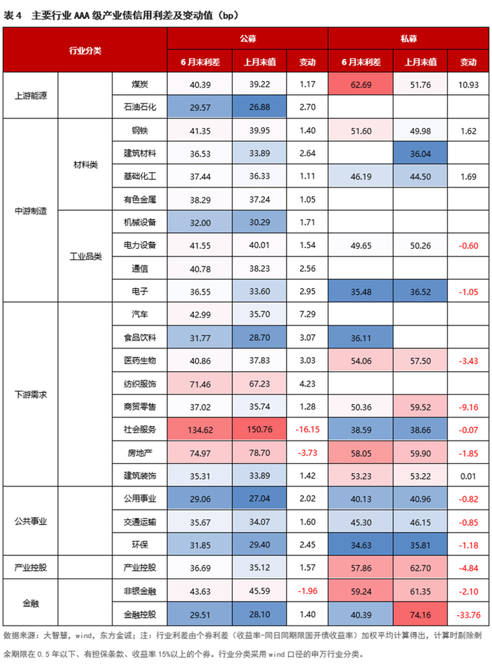 6月各行业AAA级产业债信用利差涨跌互现,公募债利差多数小幅走阔,私募债利差多数收窄。公募债中,非银金融、房地产、社会服务等行业利差收窄,其余行业利差走阔;私募债中,煤炭、钢铁、基础化工、建筑材料等行业利差走阔,其他行业利差均收窄。