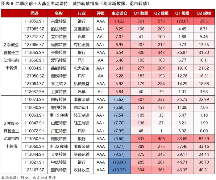 个券层面,剔除新披露转债、退市转债与转债价格变动导致的市值变化后,二季度基金主动增持最多的转债分别为银行业兴业转债(14.22亿元)、齐鲁转债(6.54亿元),交运行业的韵达转债(8.29亿元)、汽车行业的立中转债(7.07亿元)、资源板块的恒邦转债(6.95亿元)。主动减持幅度最大的转债分别为猪肉板块的温氏转债(13.33亿元),金融板块的中信转债(-13.06亿元)、浙22转债(8.77亿元)、南银转债(8.60亿元)与交运行业的大秦转债(9.57亿元)。