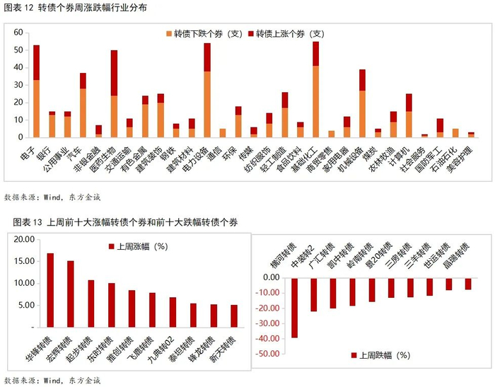 上周,转债市场主要指数继续下跌,中证转债、上证转债、深证转债指数分别收跌1.23%、1.21%、1.27%,日均成交额656.48亿元,较上周缩量60.83亿元。从价格看,转债市场多数个券上涨,564支转债中192只个券上涨,372支个券下跌,其中国防军工、传媒、非银金融、医药生物等行业多数个券上涨,下跌个券主要来自基础化工、电力设备、电子、汽车等行业。上涨个券中,华锋转债涨超16%,宏辉转债涨超15%,起步转债、东时转债涨超10%;横河转债跌逾39%,中装转2跌逾22%,广汇转债跌逾20%,凯中转债跌逾18%。