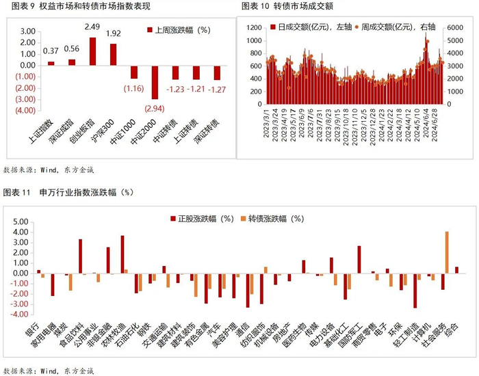 上周,权益市场主要指数集体回升,上证指数、深证成指、创业板指分别收涨0.37%、0.56%,2.49%。周一,A股低开分化,两市成交额6050.6亿元,北向资金净卖出29.4亿元;周二,A股走势分化,沪指尾盘艰难翻红,两市成交额6464.9亿元,北向资金净卖出28.8亿元;周三,A股延续震荡分化,两市成交额6880.6亿元,北向资金净卖出88.8亿元;周四,A股下探回升,两市成交额6818.8亿元,北向资金净买入13.5亿元;周五,沪深300ETF放量带动下,A股有所分化但三大指数集体收红,两市成交额6766.9亿元,北向资金净买入59.79亿元。分行业看,申万一级行业指数多数下跌,上涨行业中,农林牧渔、食品饮料涨超3%,国防军工、非银金融涨超2%;下跌行业中,轻工制造、通信涨超3%,纺织服装、有色金属、基础化工等6个行业跌逾2%。