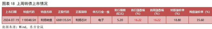 上周,无转债发行,利扬转债上市,规模5.20亿元。截至7月19日,转债市场存量规模7929.72亿元,较年初减少778.20亿元。利扬转债上市首日(同首周)收跌16.22%,从估值来看,截至上周五,利扬转债转股溢价率18.80%,显著低于市场中位数51.10%。